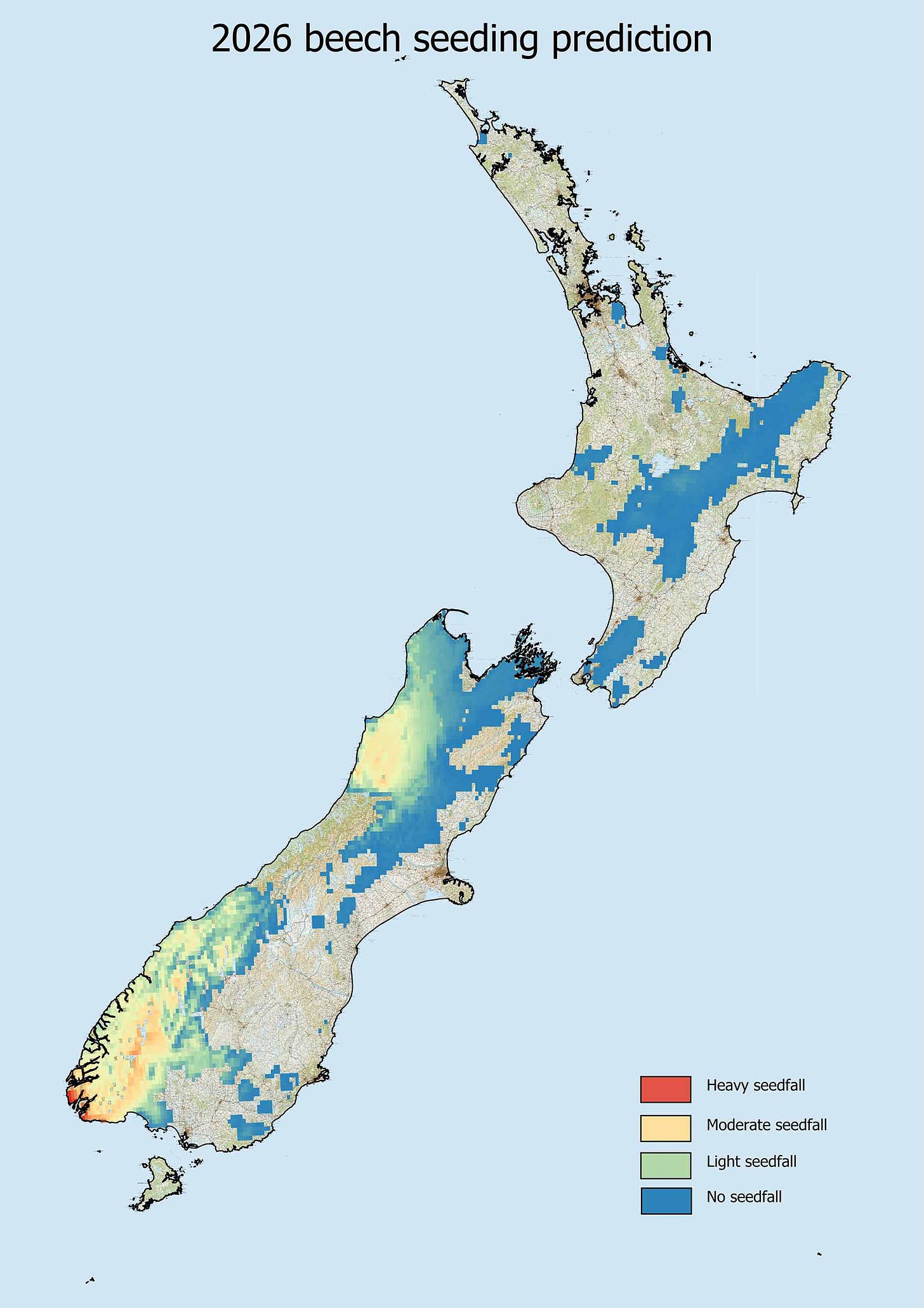 DoC have released the following prediction map, showing moderate to heavy seeding throughout Fiordland and South Westland in New Zealand’s South Island and moderate seeding in and around the Kahurangi National Park further north on the West Coast.