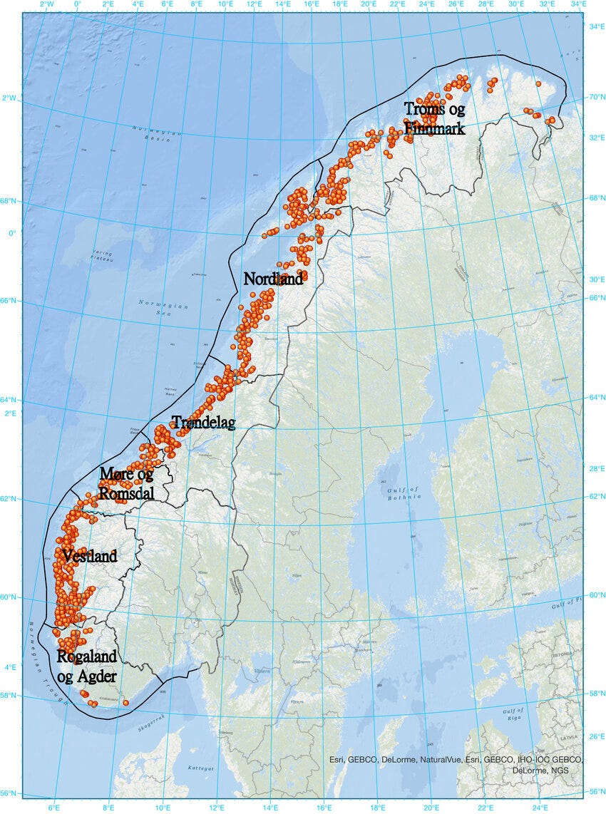 Image: Salmon aquaculture regions and site distribution in Norway in 2020. Orange circles indicate locations with salmon farm licenses. Credit: Researchgate.