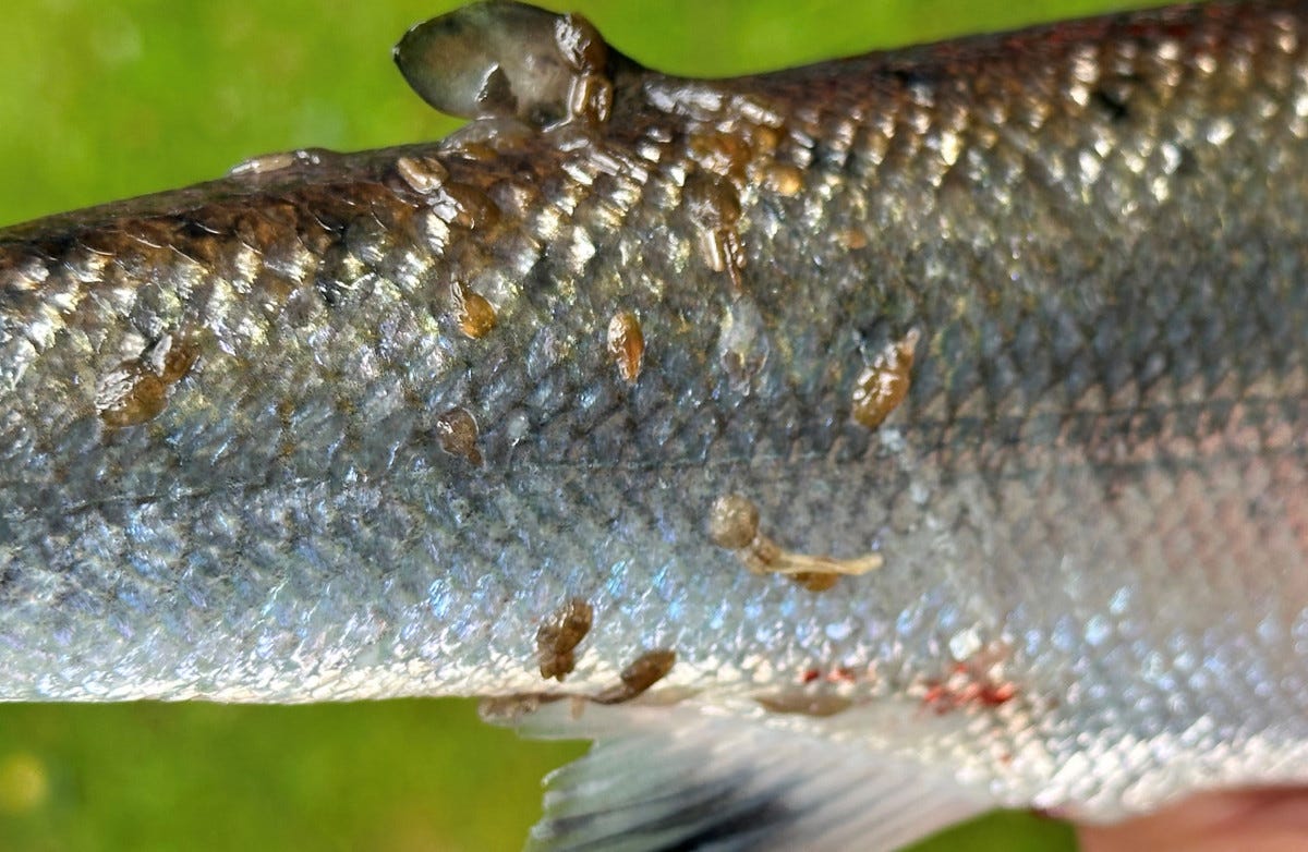 Image Credit: Norske Lakseelver. Large lice infestations on wild salmon decimate the stocks severely.
