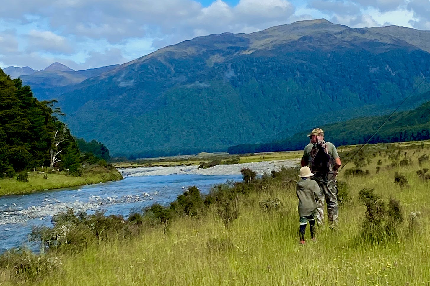 Image © 2024 Southflyfisher. Father and son exploring a New Zealand wilderness stream.