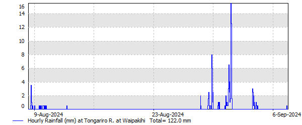 Image: Tongariro River flow at Waipakihi for the past month. The spike on September 01 flushed heavily discoloured water through the entire river.